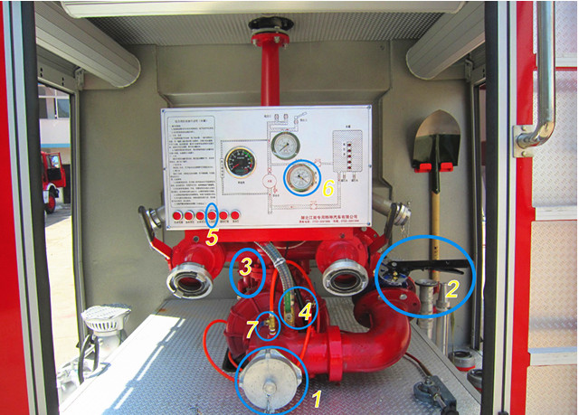 打開車輛總電源→打開車輛取力器→打開后進水按鈕→打開常規出口任意一個或兩個→接水帶→打水