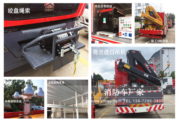 駕駛室頂部前端為長排警燈,車身后配有24V/60W火場照明燈一只,車輛兩側上方各配有紅藍相配的爆閃燈,下方安裝安全標志燈,乘員室、器材箱、 泵房內均裝有照明燈,加裝有100W警報器,回轉警燈開關、通訊設備預備接口。