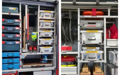 駕駛室頂部前端為長排警燈,車身后配有24V/60W火場照明燈一只,車輛兩側上方各配有紅藍相配的爆閃燈,下方安裝安全標志燈,乘員室、器材箱、 泵房內均裝有照明燈,加裝有100W警報器,回轉警燈開關、通訊設備預備接口。